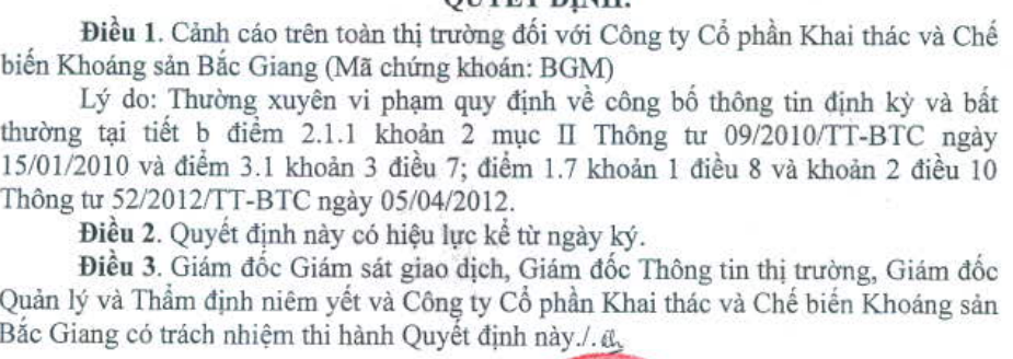 HOSE công bố quyết định cảnh cáo trên toàn thị trường đối với CTCP Khai thác và chế biến Khoáng sản Bắc Giang (BGM) như sau:
