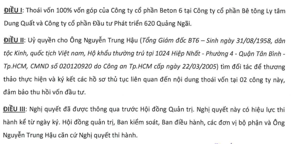 Công ty Cổ phần Beton 6 (BT6) công bố Nghị quyết Hội đồng Quản trị như sau:
