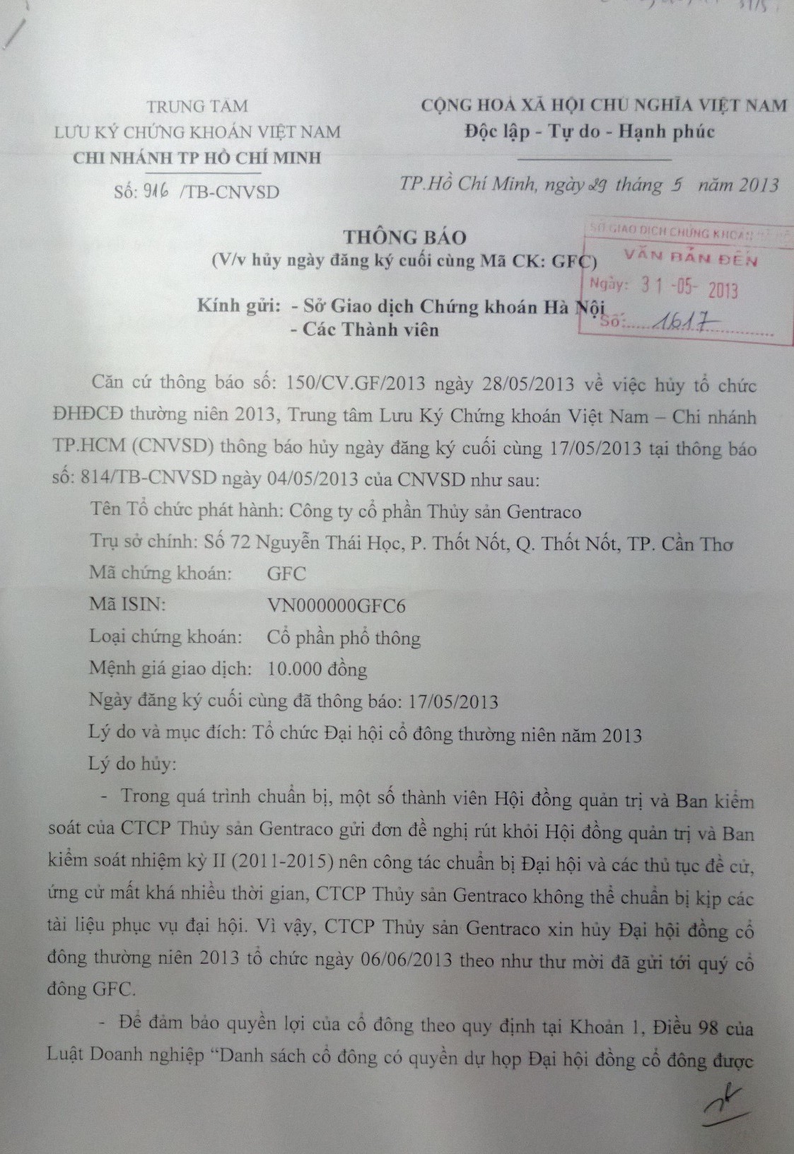 Hủy ngày đăng ký cuối cùng tổ chức ĐHĐCĐ thường niên năm 2013 của Công ty Cổ phần Thuỷ sản Gentraco (MCK: GFC).