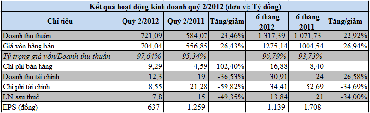 Chi phí bán hàng tăng 4,7 tỷ đồng, trực tiếp làm giảm lợi nhuận. Chi phí tài chính quý 2/2012 giảm 60% so với cùng kỳ nhờ khoản hoàn nhập dự phòng giảm giá chứng khoán trị giá 13 tỷ đồng.